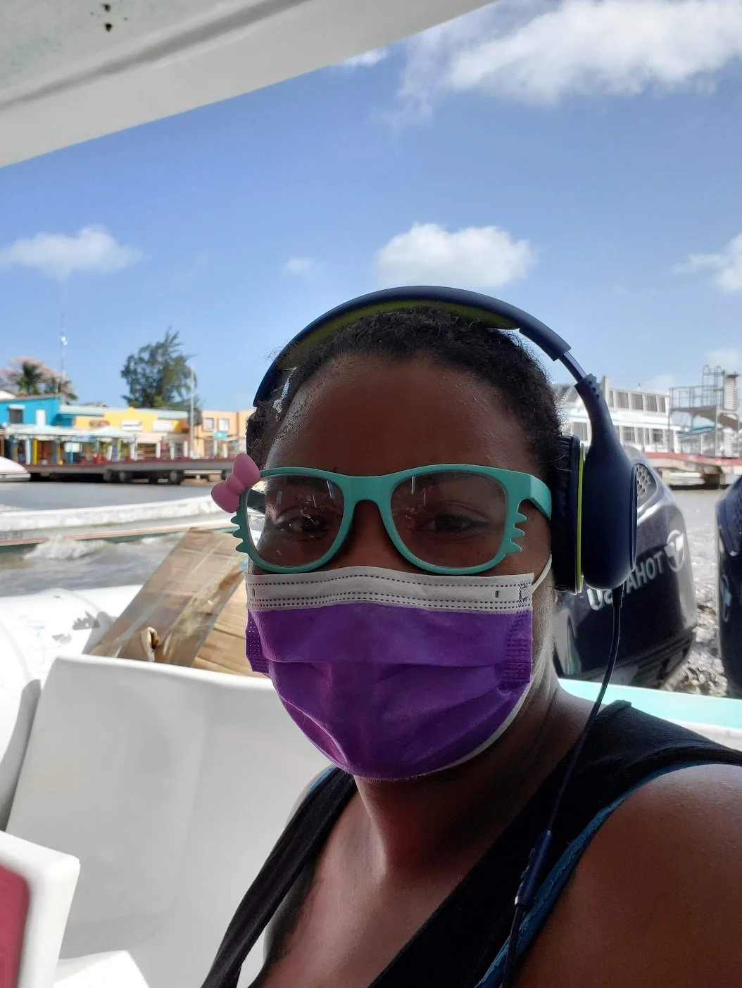 On my second day in Caye Caulker, I woke up early, ready to explore. My first stop was Eylon’s House of Fry Jacks, where I had my very first fry jack. A fry jack is a Belizean breakfast classic that did not disappoint—fluffy fried dough, filled with your choice of items. I got one filled with beans and cheese. Man, was it filling. It was the perfect fuel for a day for my first off-island excursion. I was heading to San Pedro for a day trip. I managed to stop back at my hotel room in time to change into a bathing suit, grab the photocopy of my passport, my driver’s license, a towel, and the Mega Boom speaker for my adventure off the island, and then tossed them into my waterbag. I strolled over to the San Pedro Water Taxi, got tickets for the 9:45 am boat. While on the dock, I listened to the sounds of the waves crashing against the pillars underfoot. The boat arrived a few minutes after the intended time. This one was different from Ocean Ferry; the boat was bigger, and we could sit up top, which I promptly did.